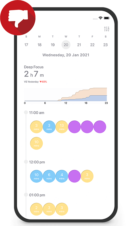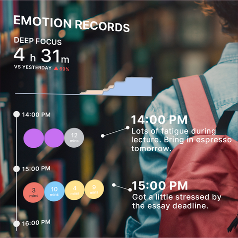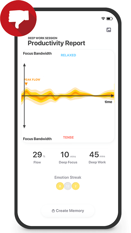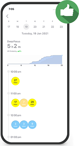 Don’t stay in the dark. Get to know every focus, calm, distraction, stress, fatigue while you work. Find out when and why you lose focus or see how well you do today.